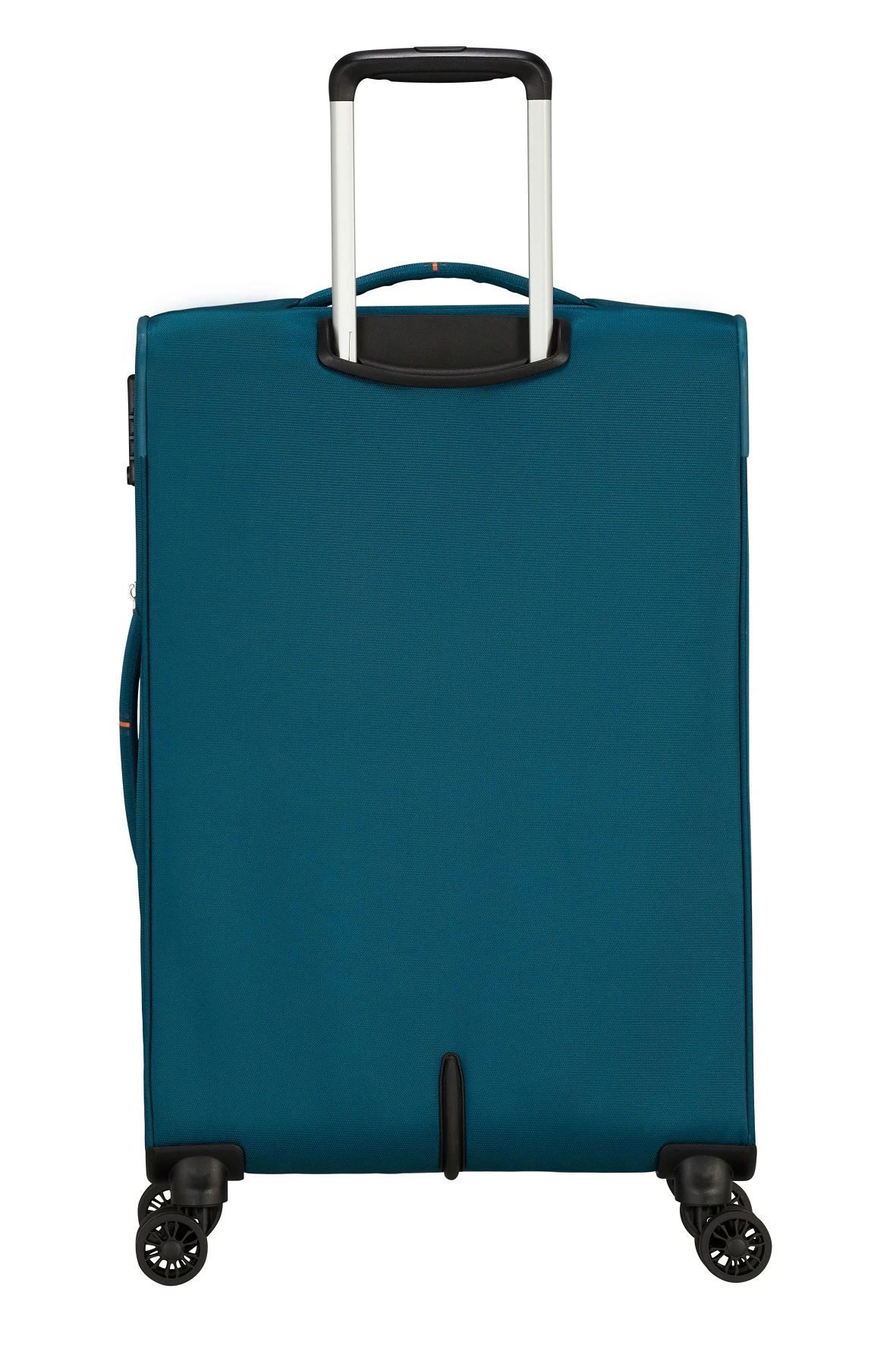 Maleta de viaje mediana de 67 cm con 4 ruedas de apoyo y expandible de American Tourister modelo Crosstrack en color azul y detalles naranjas