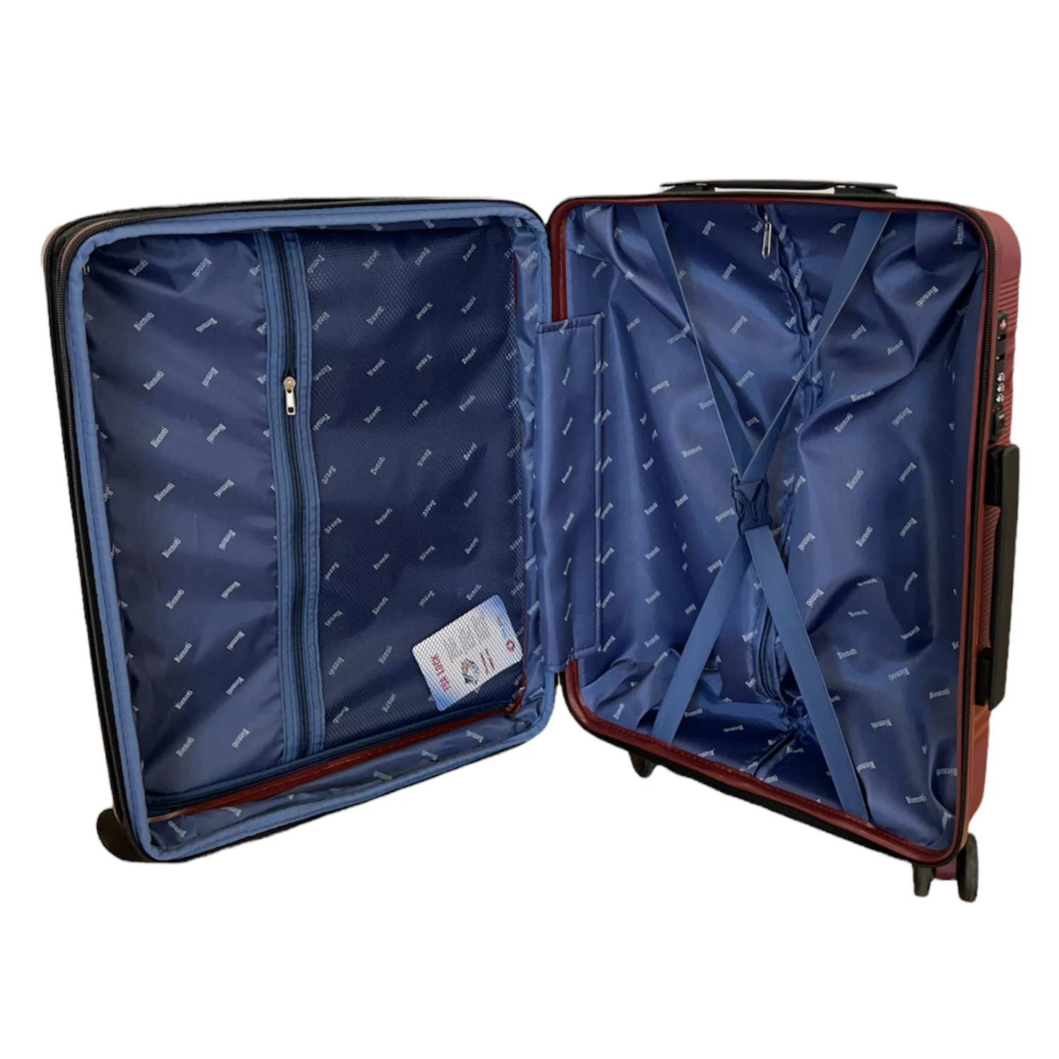 Maleta Bienoti de diseño bilbaino, tamaño cabina , con medidas 56 x 38 x 22 cm , con una doble cremallera que se puede expandir hasta 27 cm. Capacidad de 41 litros, expandible a 50,2 ltrs. Fabricada en resistente polipropileno. Dispone de cerradura con combinacion de 3 digitos y cerradura TSA, para viajar seguro a los aeropuertos de EEUU. Color Granate