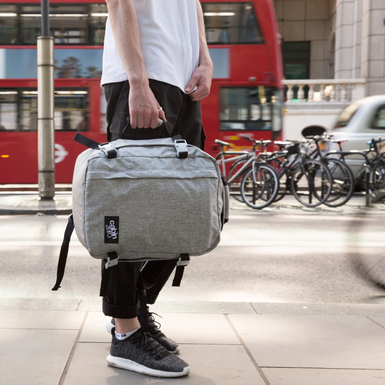 Mochila-bolsa de viaje de la marca Cabin Zero, robusta , ligera y funcional. Tiras para llevar a la espalda acolchadas . Tambien dispone de asa superior y asa lateral para poder llevarlo de mano. En el interior compartimento acolchado para poder llevar el portatil y bolsillos con cremallera. Recubrimiento resistente la agua. Perfecto para llevar en el avion debajo del asiento. Medidas 39 x 29,5 x 20 , con capacidad de 28 Ltrs. Color Gris claro.