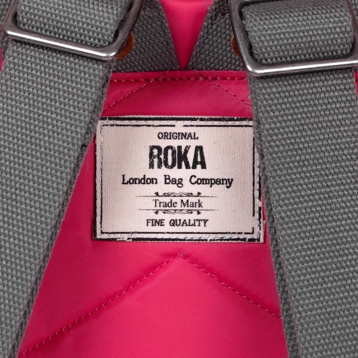 Mochila urbana modelo Bantry B de la marca Roka London de tamaño pequeña en color rosa fresa con cierre de cremallera y de nylon más lona resistente. La mochila tiene un compartimento interior para ordenador además de otros dos bolsillos de cremallera. En el exterior hay un bolsillo de cremallera. Las correas son de algodón para una mayor comodidad.